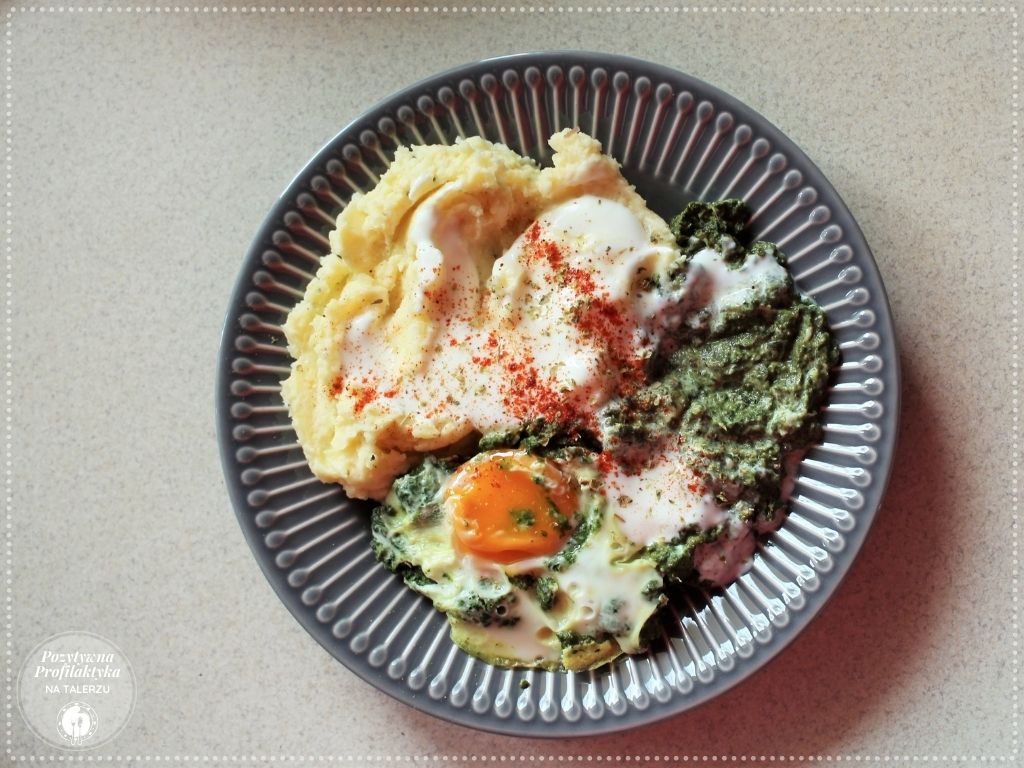 Na talerz wyłóż ziemniaczane puree, jajko w szpinakowo-jogurtowym sosie. Całość udekoruj pozostałym jogurtem.