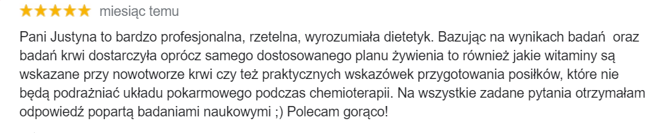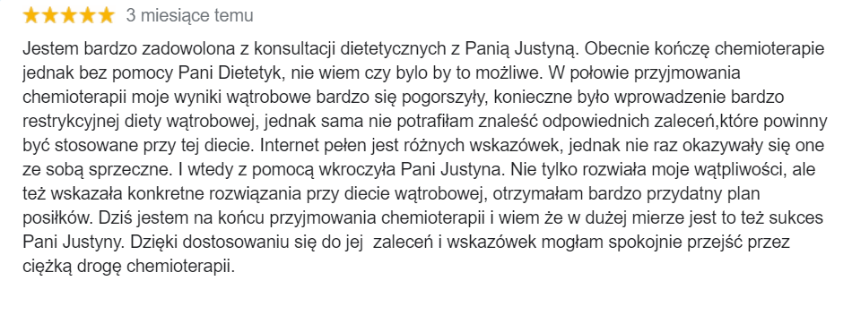 Dlatego na konsultacjach zawsze jest czas na omówienie wątpliwości, pytań związanych żywieniem w chorobie nowotworowej. Osobiście podchodzę do rozmów na temat zasad właściwego odżywiania bardzo chętnie, zachęcam nawet do przygotowywania listy pytań przed naszymi spotkaniami :)